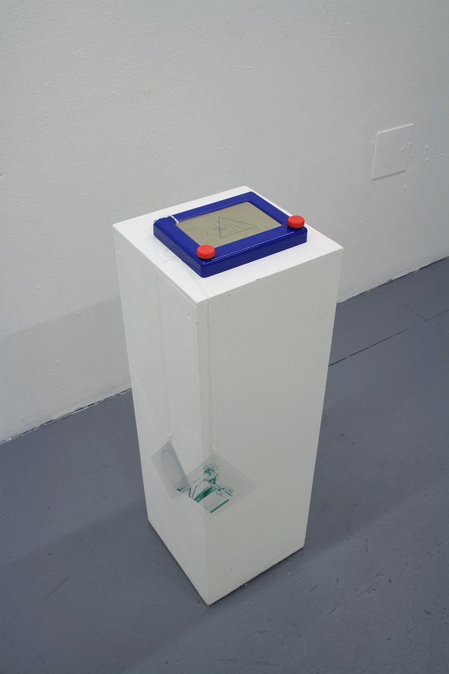 Naprosto odlišnou strategii zaujal Marek Meduna, jehož díla na výstavě jsou především vtipným a výtvarně pozoruhodným komentářem k danému tématu.